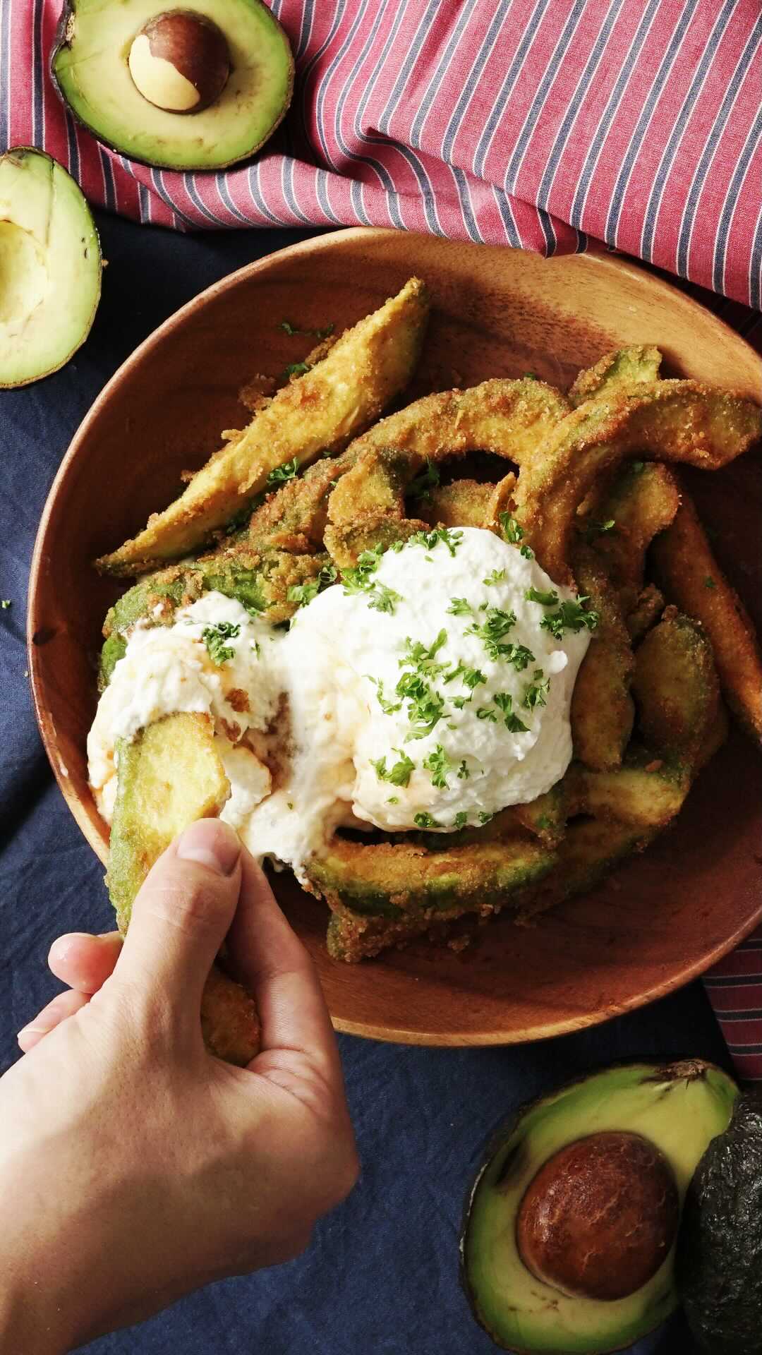4. お皿にアボカドのフライをのせ、サワークリームソースをのせる。上からチリソースをかけ、パセリをふりかける。
