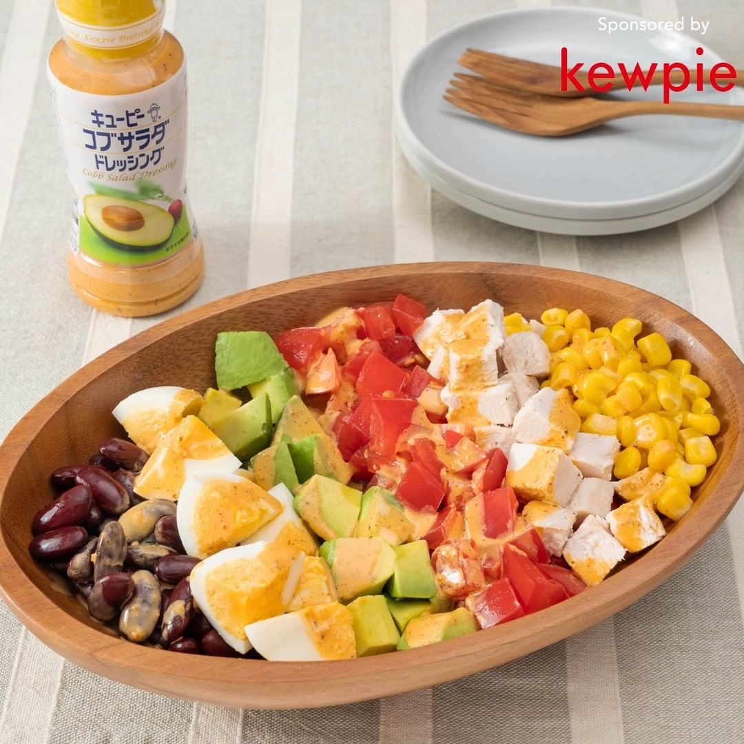 3. 器に1、2、レッドキドニー 、コーンを並べて盛り付けます。コブサラダドレッシングをかけ完成です。