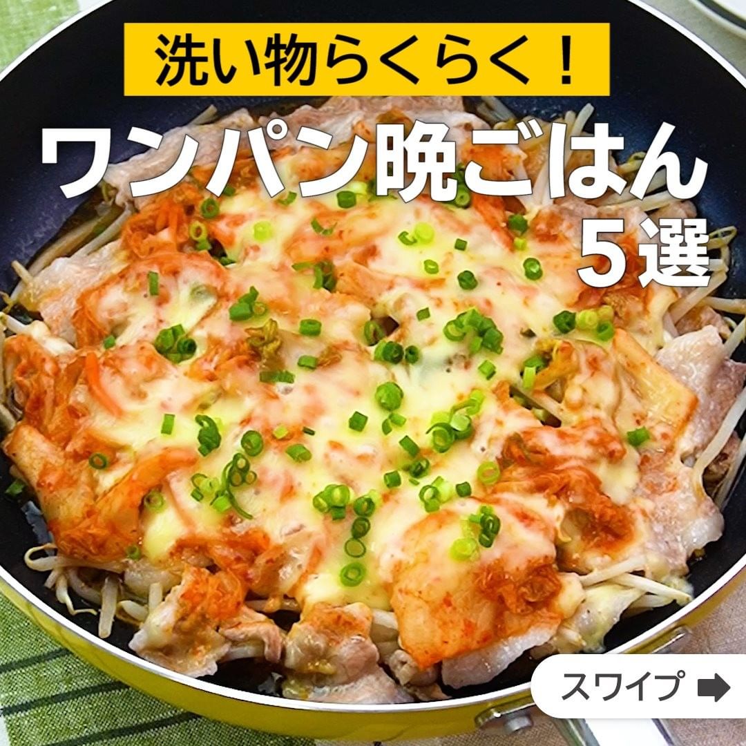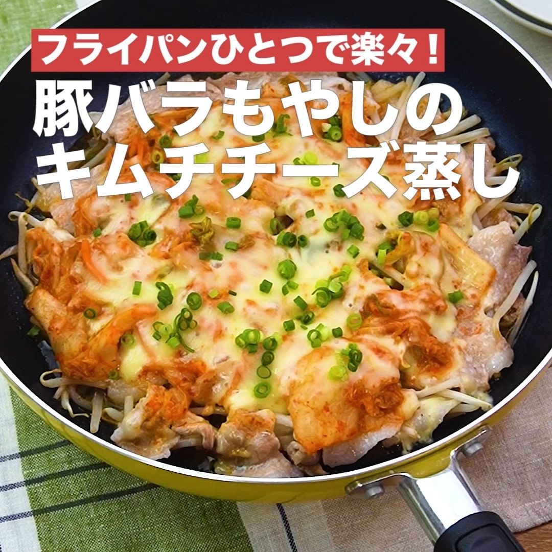 ①<フライパンひとつで楽々!豚バラもやしのキムチチーズ蒸し>