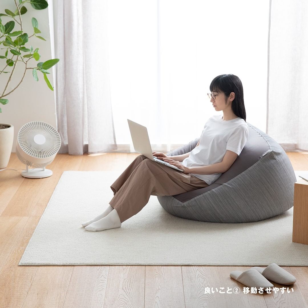 背の低い家具は、背の高い家具に比べて重量が軽いことが多く、動かしやすいのも特長です。体にフィットするソファは総重量が約6kgと軽く、好きな場所へ持ち運んで使うことができます。