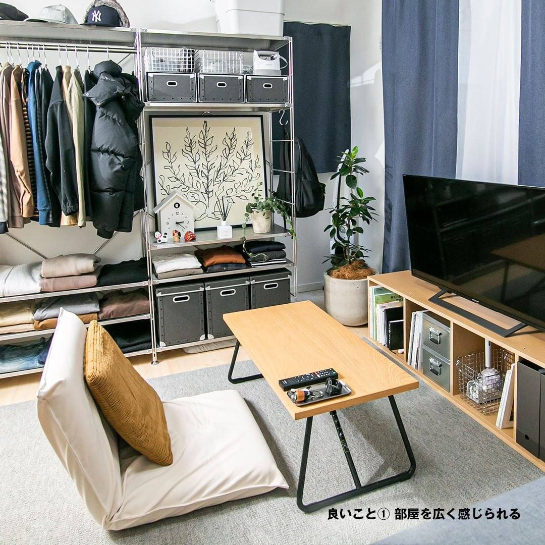 ローテーブルや座いすなど、背の低い家具は、背の高い家具に比べて、家具から与えられる圧迫感を軽くでき、部屋そのものを広く感じられます。