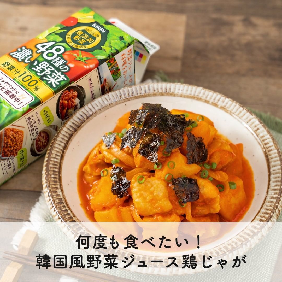 何度も食べたい!韓国風野菜ジュース鶏じゃがのご紹介です。野菜本来の旨みと焼肉のタレの甘辛さが合わさった煮汁がホクホクのじゃがいもに染みこみ、クセになるおいしさです。「キリン 無添加野菜 48種の濃い野菜100% 」を使うことで簡単に味が決まり、調味料たったの2つで、長時間煮込んだようなコクのある味わいになりますよ。丼にしてもおいしく召し上がっていただけます。ぜひ新感覚の鶏じゃがにチャレンジしてみてくださいね。