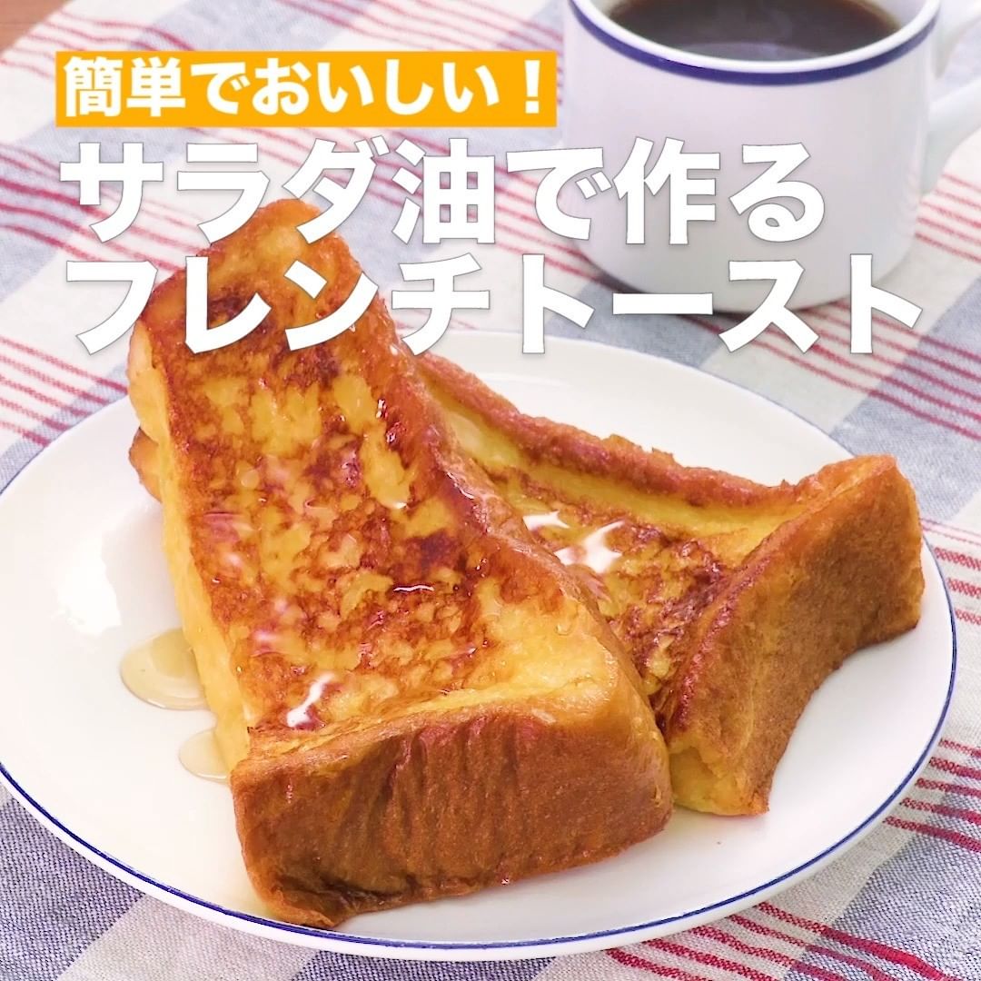バターではなく、サラダ油で焼くあっさりとしたフレンチトーストのレシピをご紹介します♪フォークで食パンに穴を開けるのがおいしさの秘訣!卵液がよく染み込み、柔らかい食感になります。1枚で満足感があるので、朝食にぴったりです。