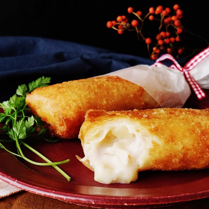 4. 春巻きの中央に3をのせて巻く。溶かしたバターを表面にぬり、もう一度春巻きの皮で巻く。巻き終わりは水溶き片栗粉を塗ってとめる。