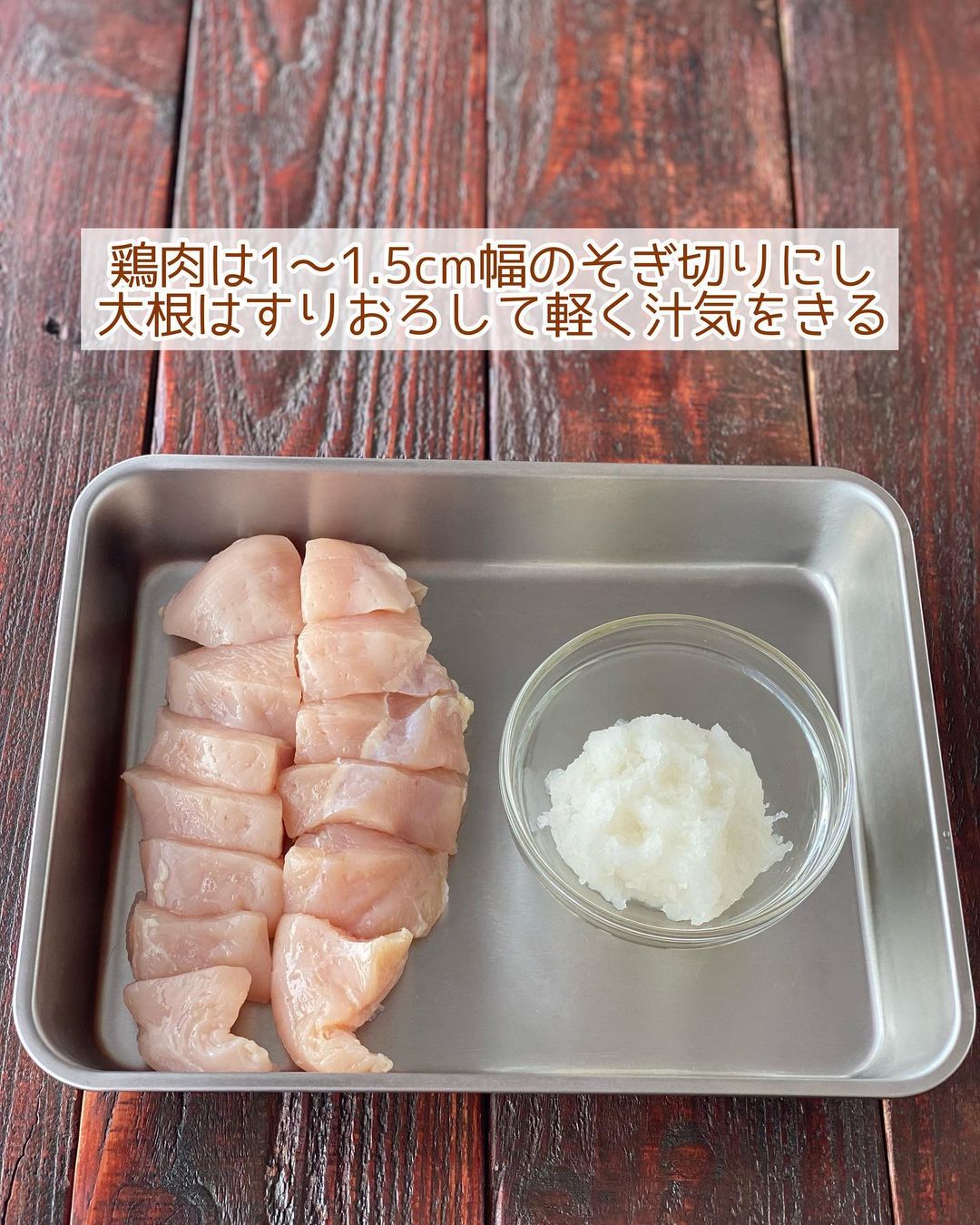 ➊鶏肉は横半分に切ってから、さらに𝟷〜𝟷.𝟻𝚌𝚖幅のそぎ切りにする。〔𝙰〕と共にポリ袋に入れてよく揉み込み、空気を抜いて口を閉じ、そのまま𝟷𝟶分ほどおく。大根はすりおろし、ザルなどにあげて水気をきる。