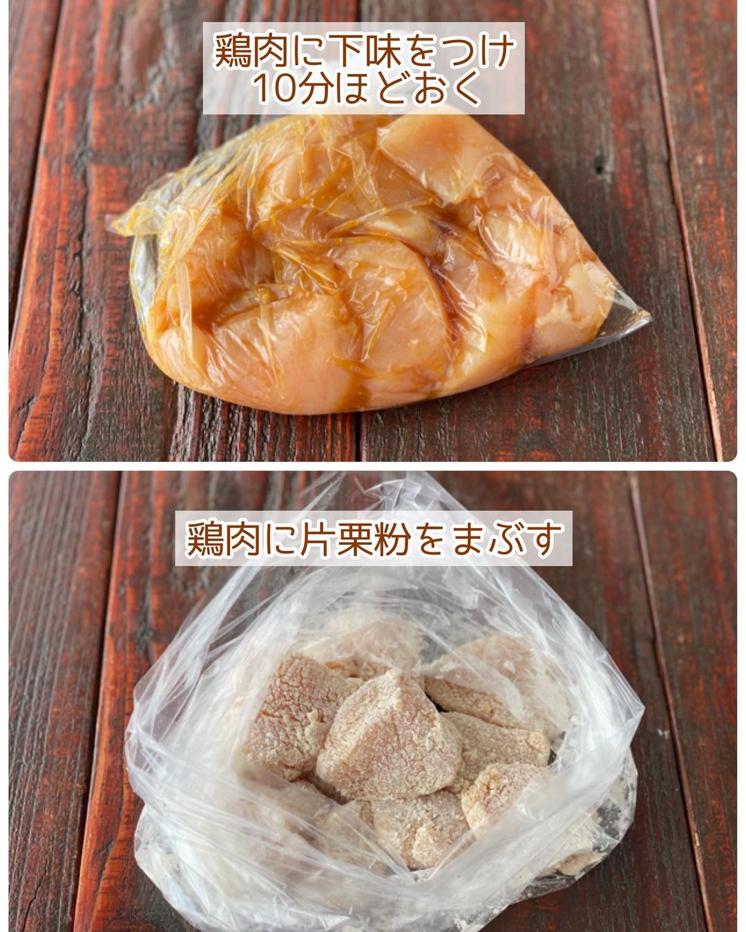 ➋鶏肉に片栗粉をまぶす。(新しいポリ袋を使用するか、バットに取り出してからまぶしてください)