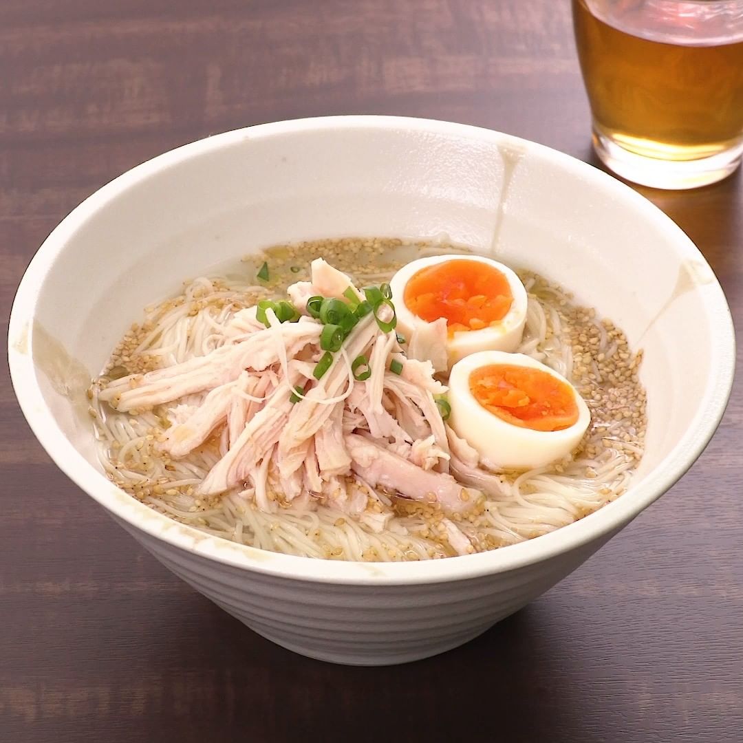 そうめんにひと手間加えたアレンジレシピのご紹介です。よく冷やしたさっぱり塩味のスープに、しっとりジューシーなサラダチキンを添えて召し上がれ♪お好みでラー油やキムチを加えて、ピリ辛にするのもおすすめです!市販のサラダチキンは塩気が含まれるため、スープはあっさり薄味に仕上げています。お好みで水分量や塩加減を調整してお試しください。