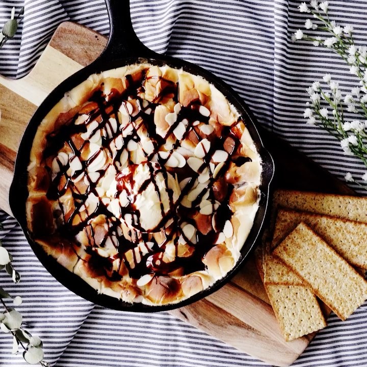 3. 熱いうちにアイスをのせ、スライスアーモンド、チョコレートシロップを飾り、グラハムクラッカーですくっていただく。