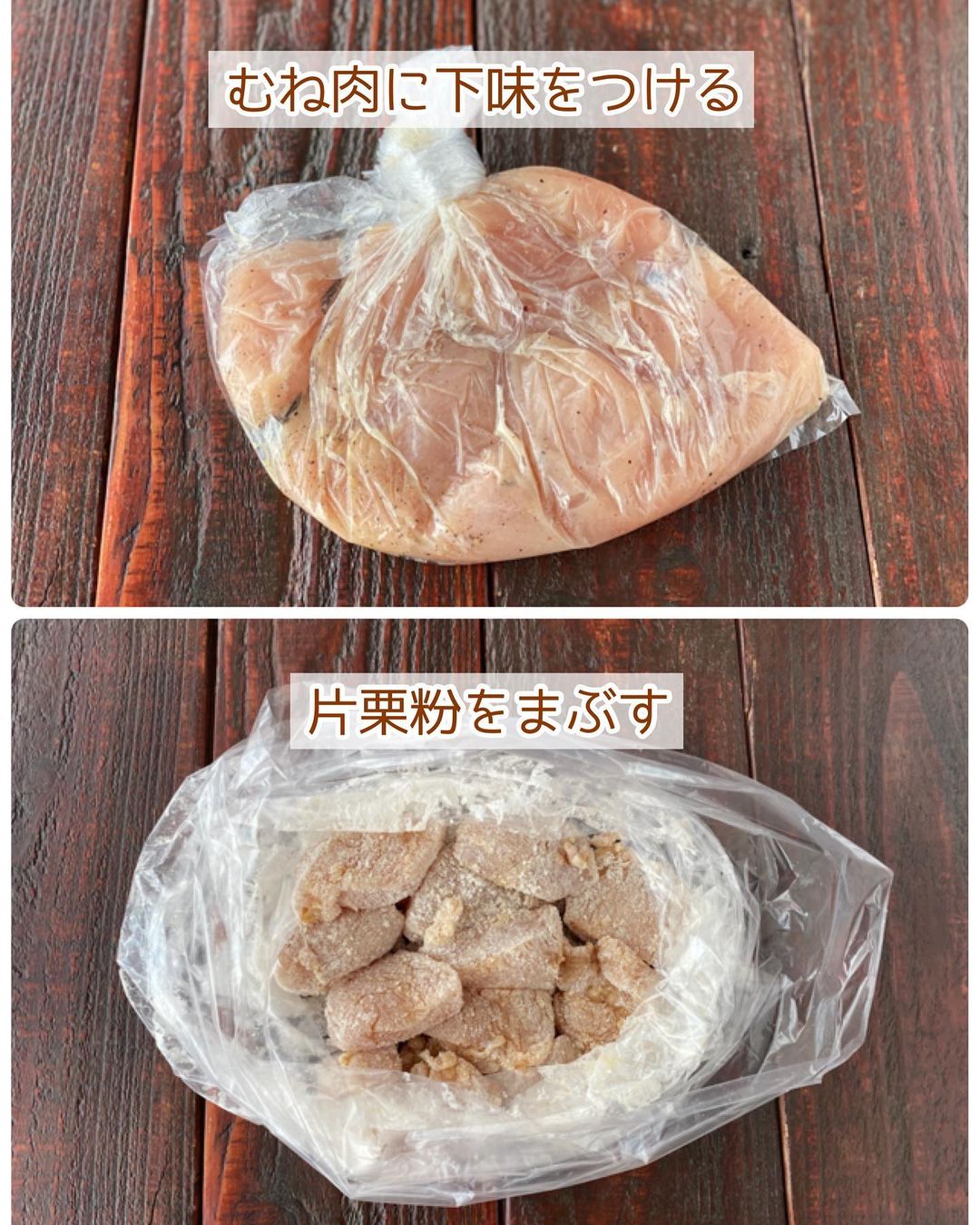 ➋1に片栗粉をまぶす。(新しいポリ袋を使用するか、バットに取り出してまぶすと◎)