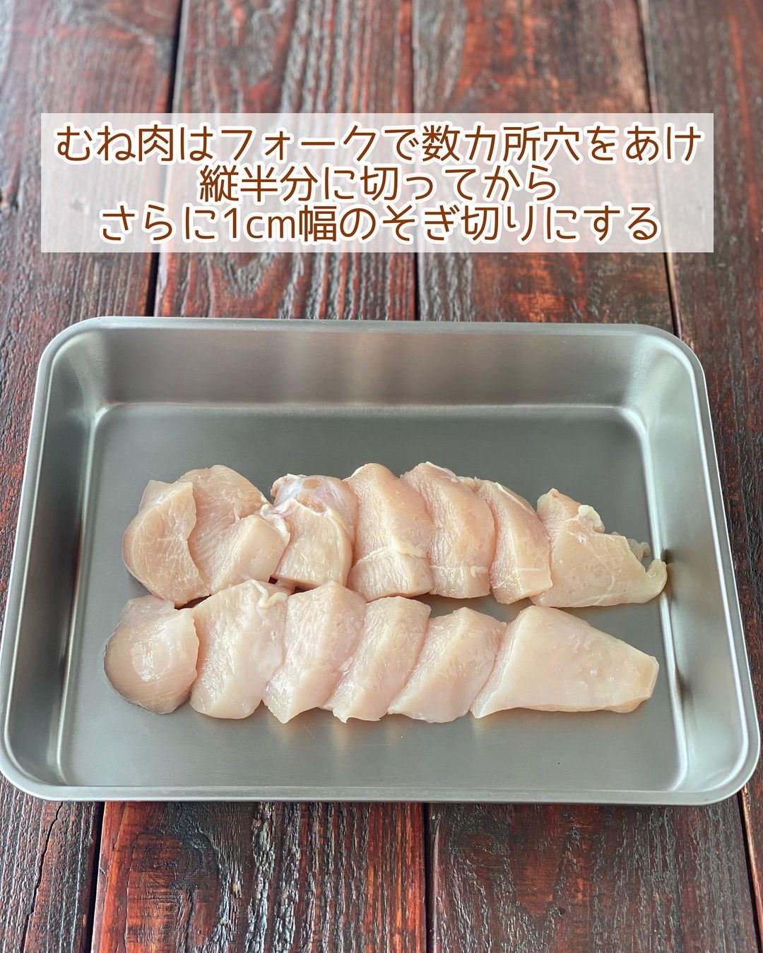 ➊鶏肉は皮をとり、フォークで数カ所穴をあける。縦半分に切ってからさらに𝟷𝚌𝚖幅のそぎ切りにし、〔𝙰〕を揉み込んで𝟷𝟶分ほどおく。