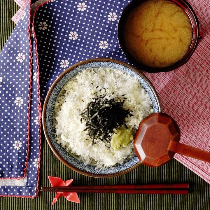 6.どんぶりに温かいご飯をよそり、パルメザンチーズとちりめんじゃこ、わさび、きざみのりを盛り付け味噌汁を注ぐ
