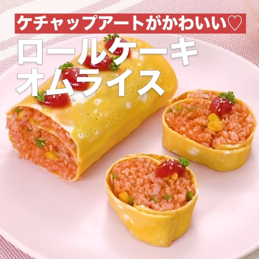 ④<ケチャップアートがかわいい♡ロールケーキオムライス>