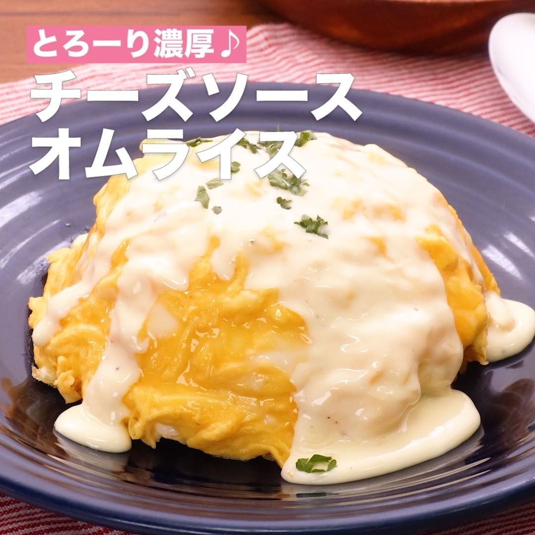 コクのあるチーズソースがポイントの、半熟オムライスです!ケチャップライスは電子レンジを使って作るので、時間がないときでも簡単♪トロッととろけるチーズにふわふわの卵がマッチして、幸せになれる一品です。
