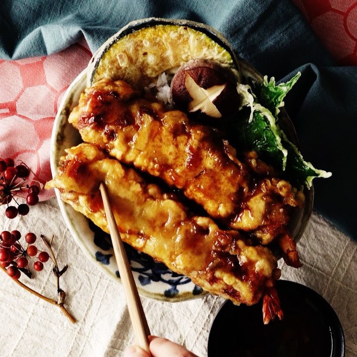 5. 温かいご飯に海老天ぷらを盛り付け、お好みの量のタレをかけたら完成!
