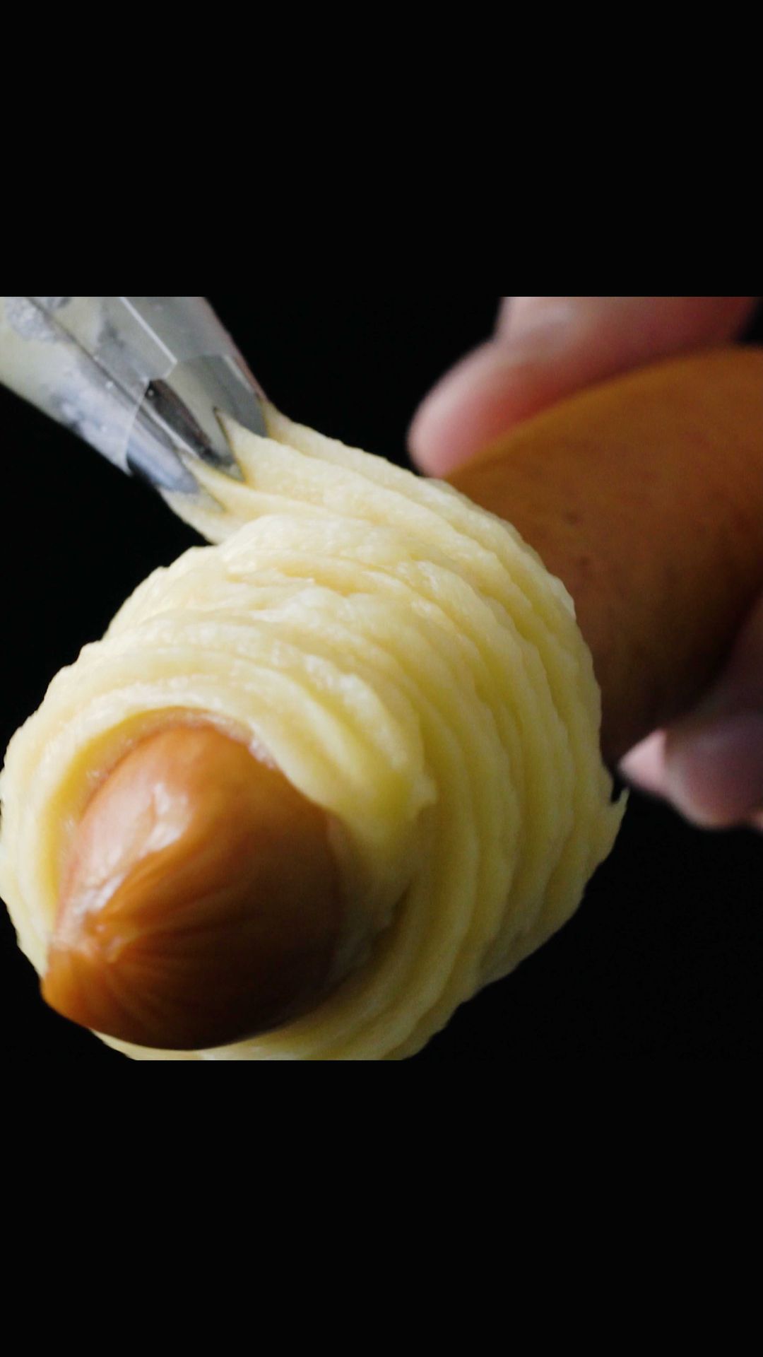 3. ソーセージを回しながらチュロス生地を絞る。⠀