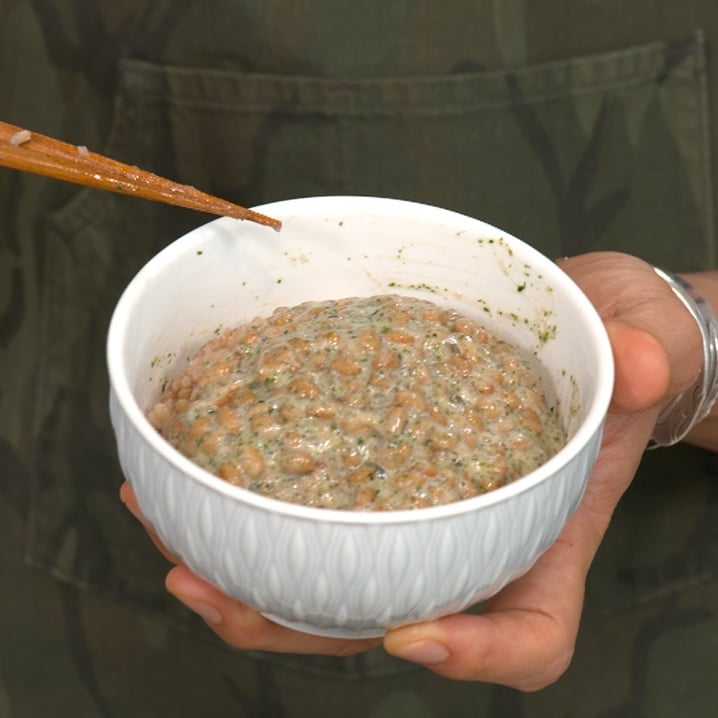 ①納豆(1パック)を茶碗に入れ、よく混ぜる。
