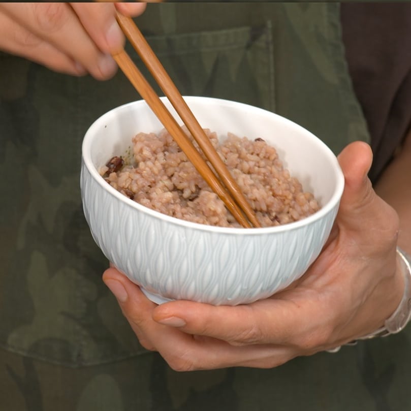 ④納豆と酵素玄米がひっくり返るように箸を使って「ヌンッ!」と半回転させたら完成!
