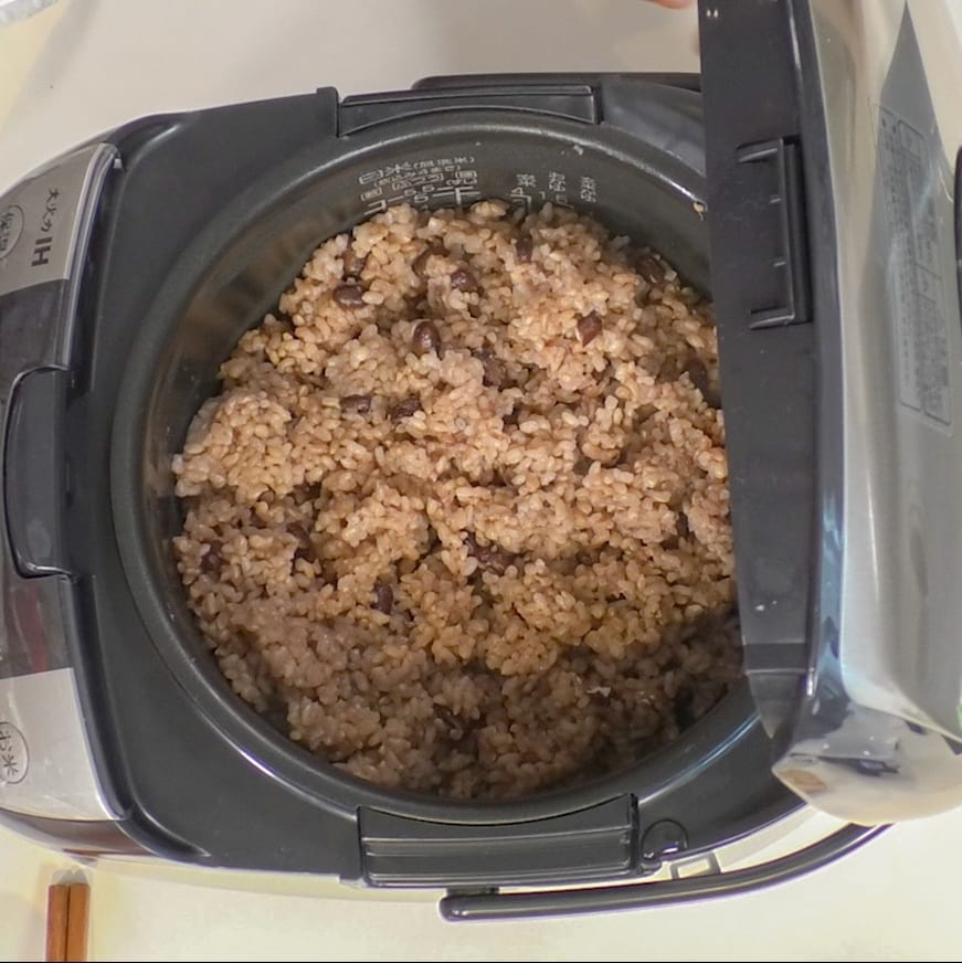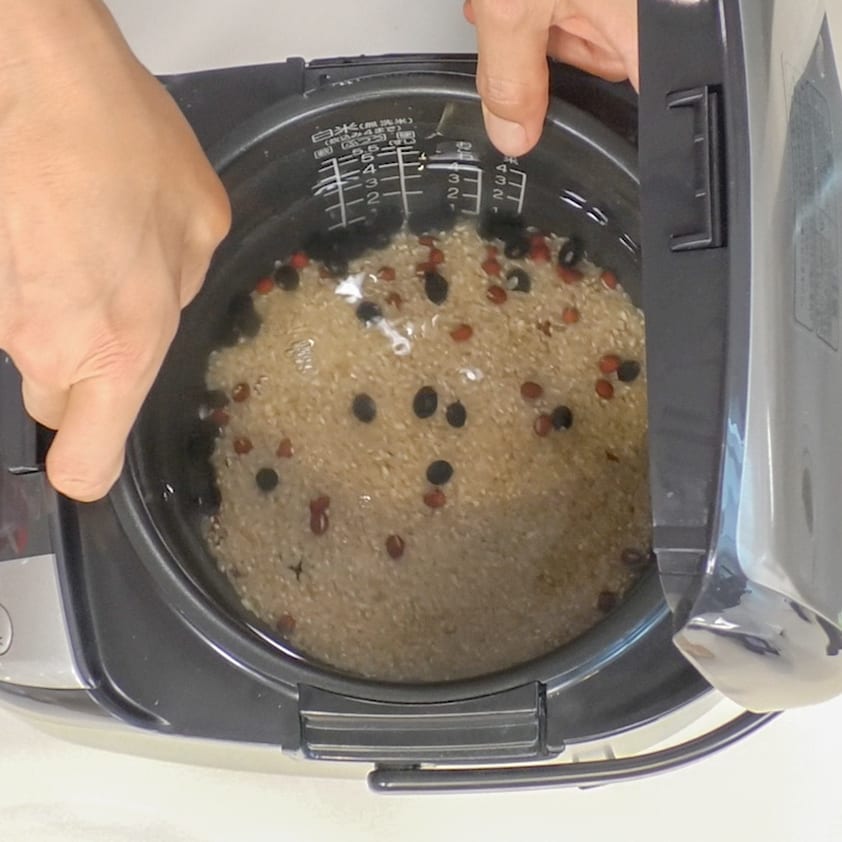 ②炊飯器の内釜に①を入れ、玄米3合の目盛りより少し多めに水を入れる