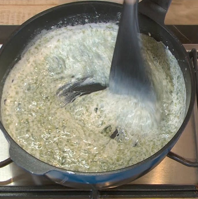 ①フライパンにバター(30g)小麦粉(30g*強力粉推奨)牛乳(300~500ml)焼きのり(全型3枚)顆粒コンソメ(4.5g)塩(小さじ1/4)を入れて中火にかけ、ヘラで混ぜ続ける。海苔が溶け、ソースがもったりしたらOK。