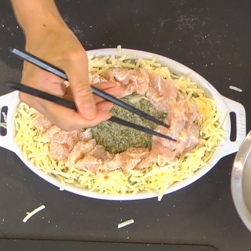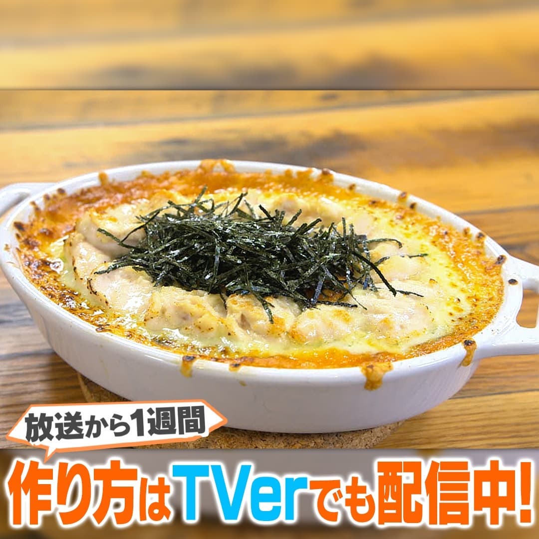 ④②のご飯の上に①のソース、ピザ用チーズ(適量)、③のささみをのせ、トースター(200℃)で約15分焼き、仕上げにあれば刻みのりをかけて完成。