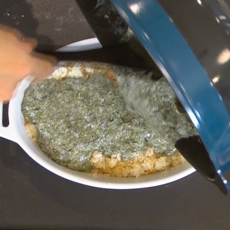 ②耐熱皿にご飯を盛り、バター(5g)とめんつゆ(小さじ1)を加えて混ぜる。