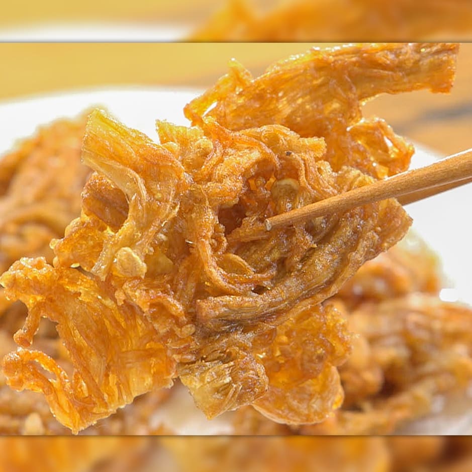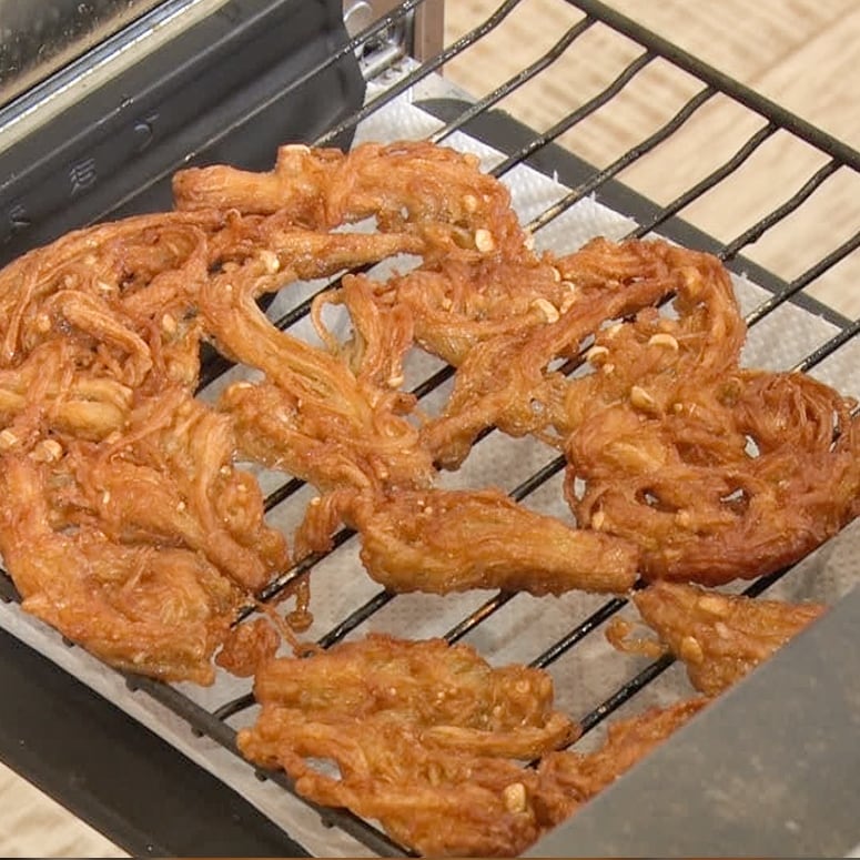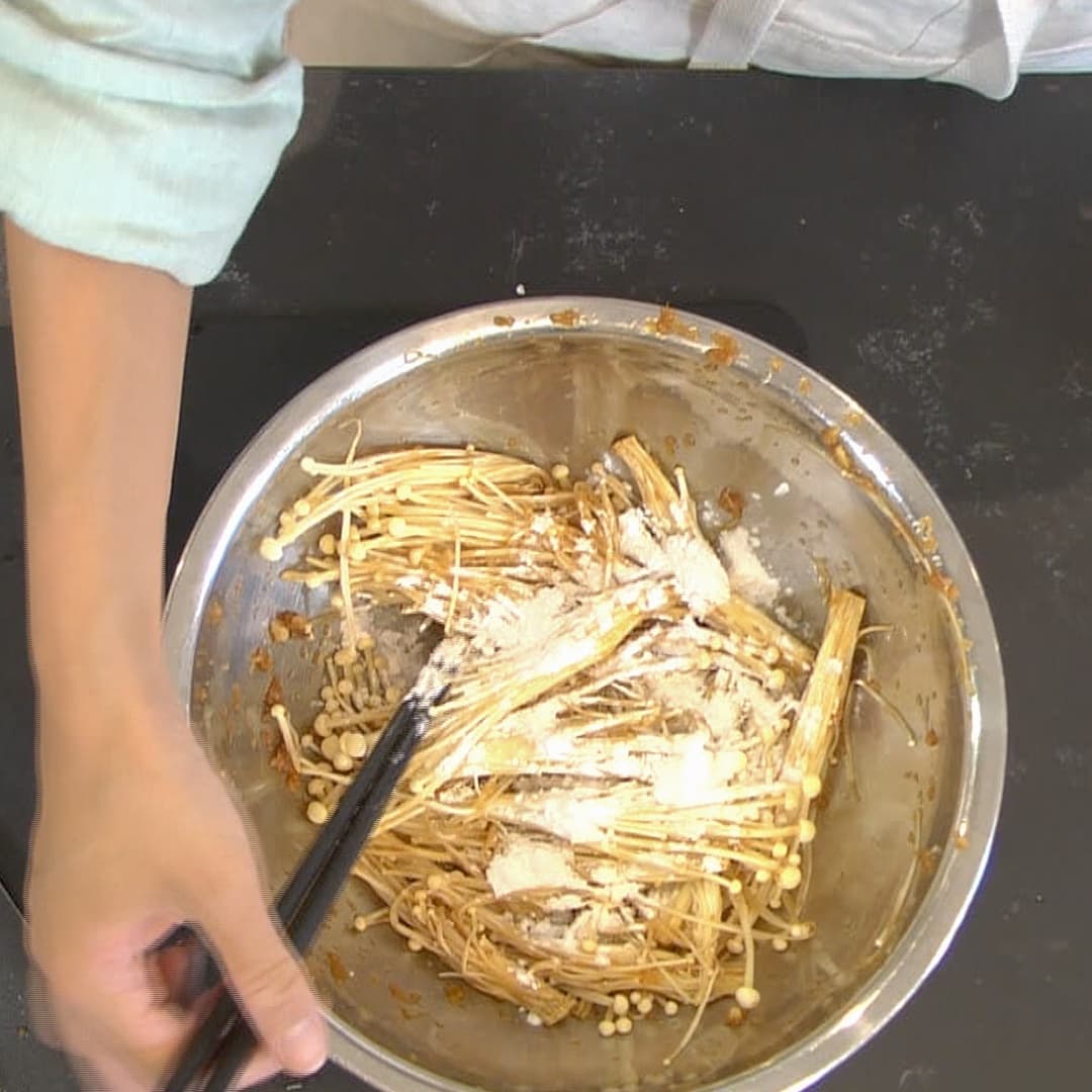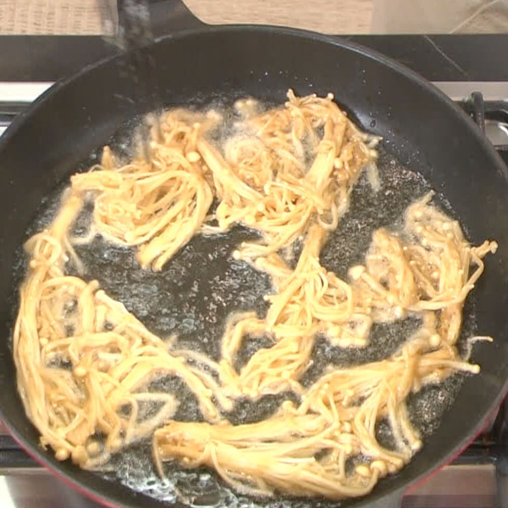 ④フライパンの底から1cmほどの深さまで油を入れて火にかけ、170°程度に温まったら③のえのきを加える