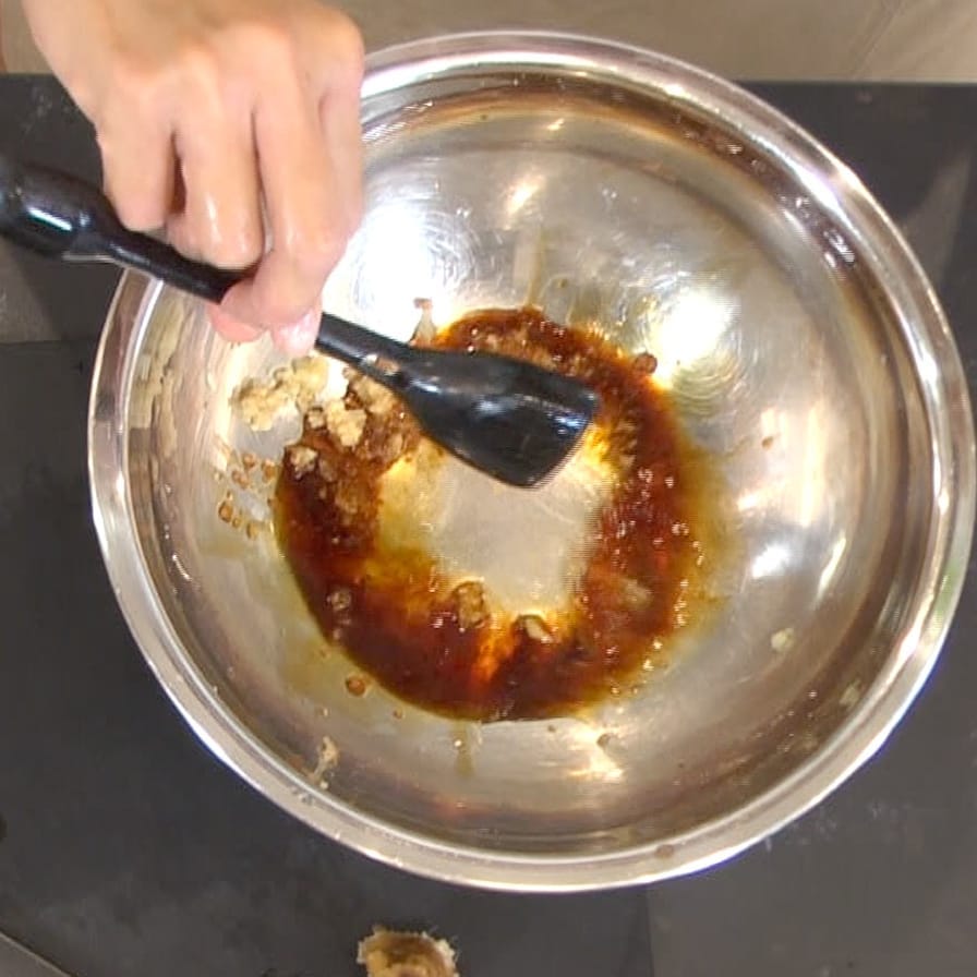 ②ボウルにすりおろしたしょうが、ニンニク(各少々)、酒、醤油(各大さじ1)を入れて混ぜ、えのきを加えよく絡める