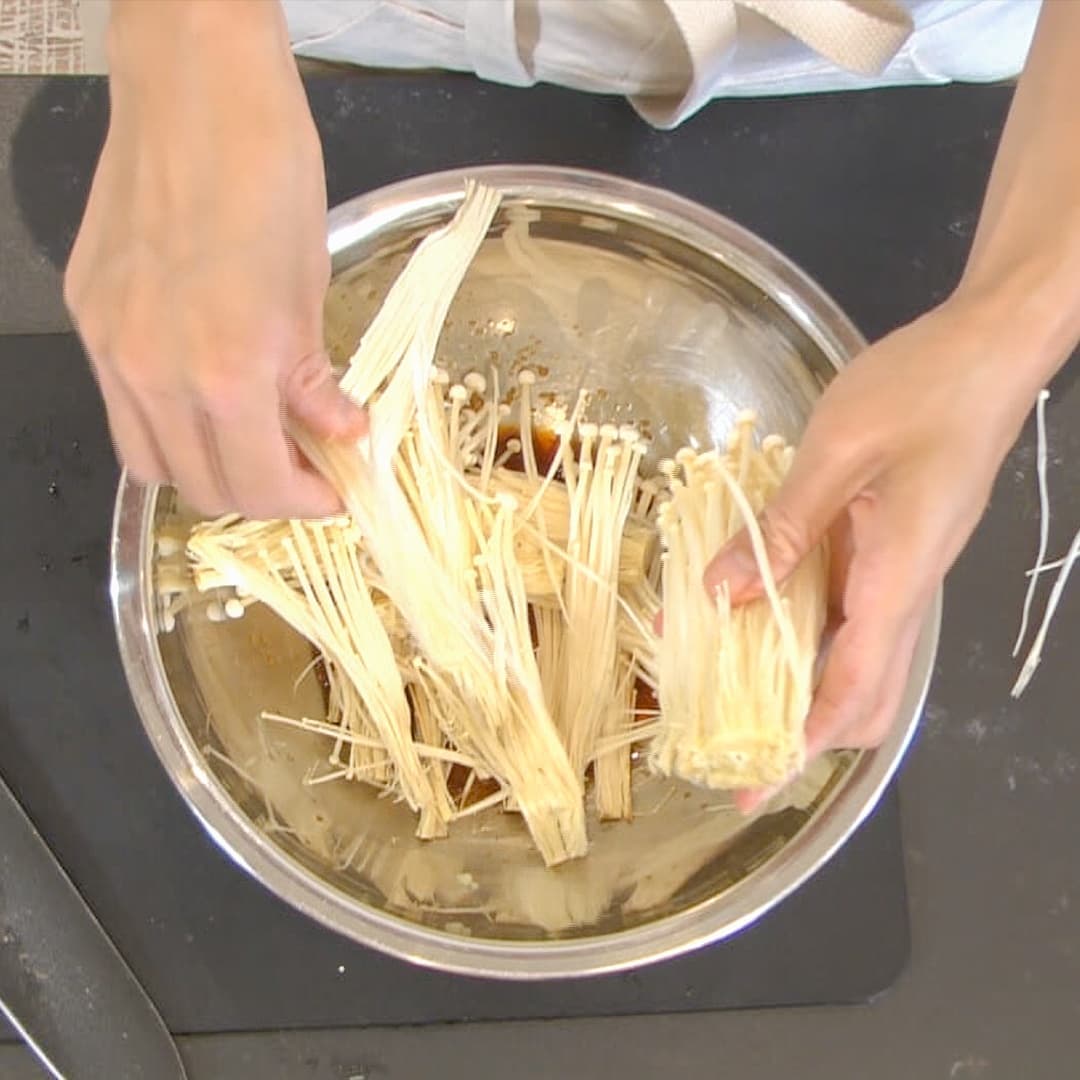 ①えのき(1袋)は石突きを切り落として、食べやすい量にさく