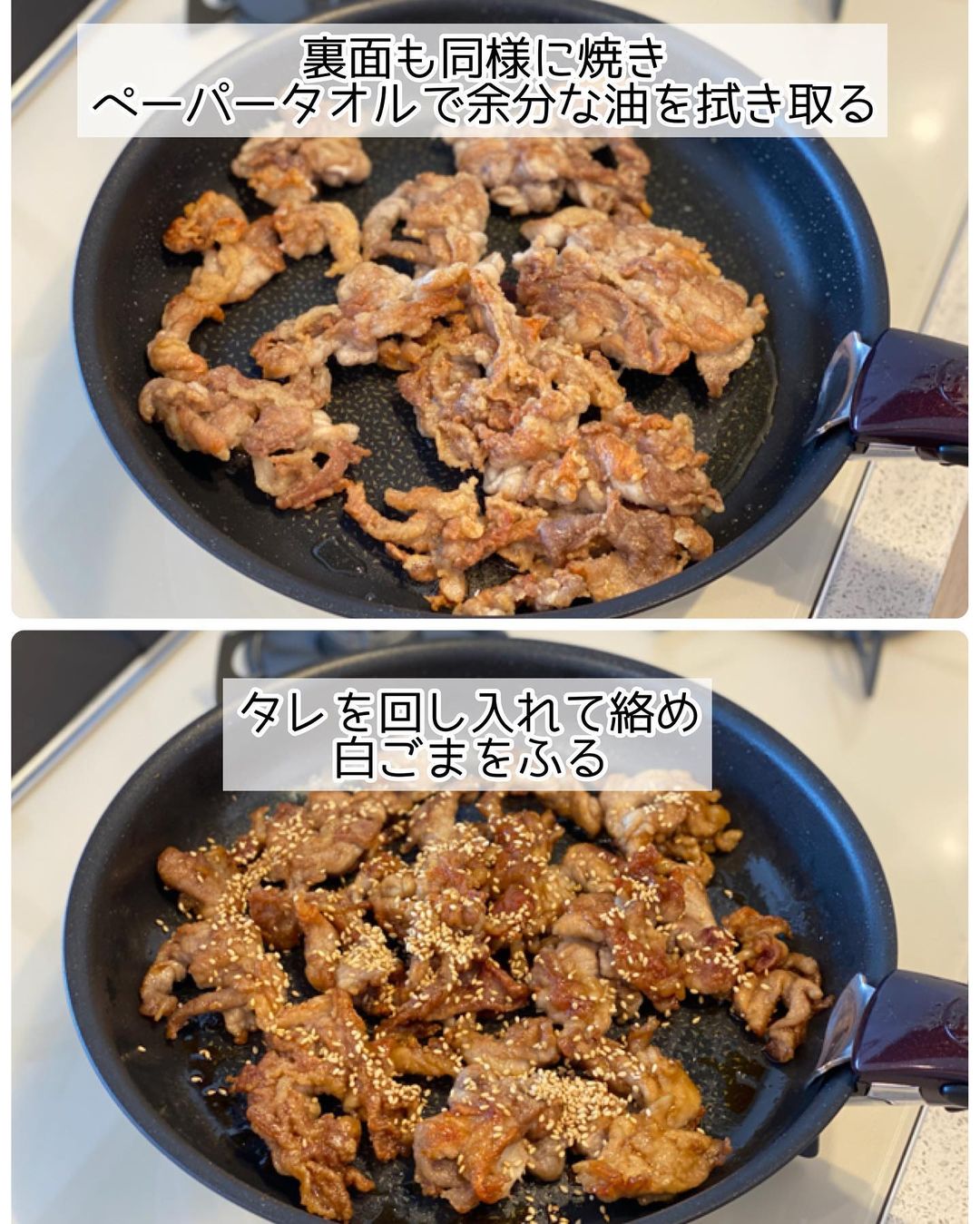 ➌ペーパータオルで余分な油を拭き取り、合わせた〔𝙰〕を回し入れて絡める。仕上げに白いりごまをふる。