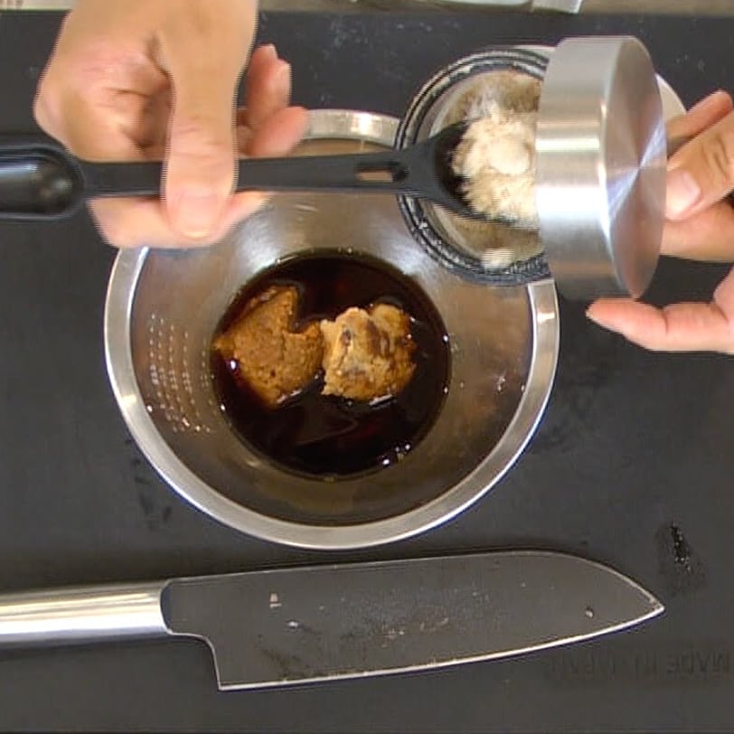 ②ボウルに醤油、酒、砂糖、味噌(各大さじ2)、すりおろしニンニク(小さじ1)、塩(少々)を入れ混ぜタレを作る