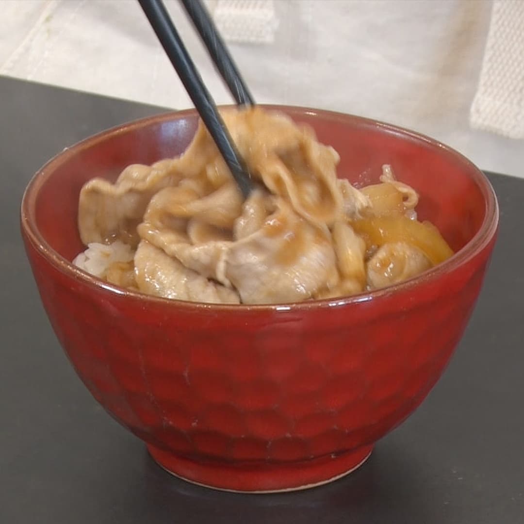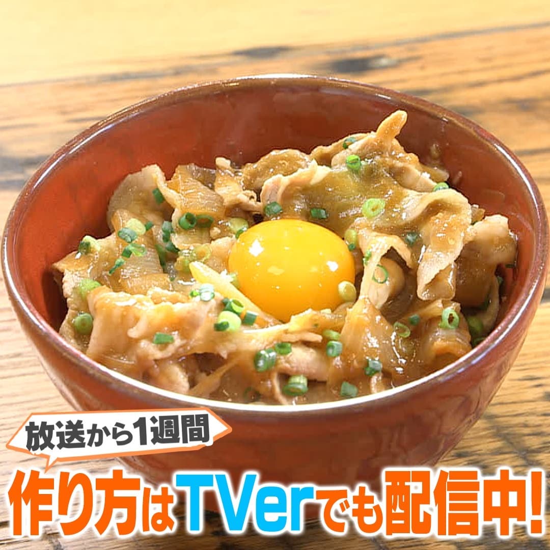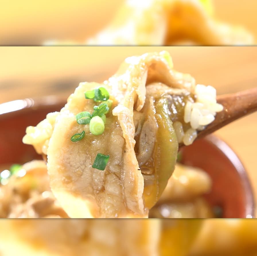 ⑤ご飯を丼に盛り付け、豚肉を③のタレに絡めてご飯に盛ったら、卵黄をのせ、小ネギを散らして完成!