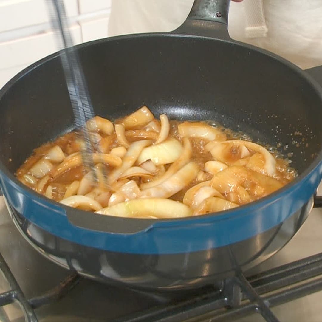 ③炒めた玉ねぎにタレと水(100ml)を加え、煮立たせたら火を止める。