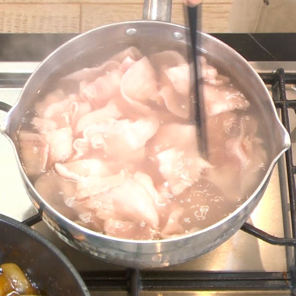 ★沸騰したお湯の温度を下げ、サッと茹でることで豚肉の余分な脂と臭みが落ち、固くなるのを防ぎます