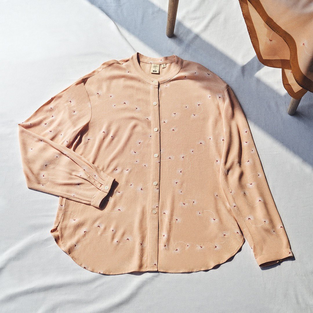Fashion designer Hana Tajima’s classic shirt with printed band collar! Available in pink and blue colors!