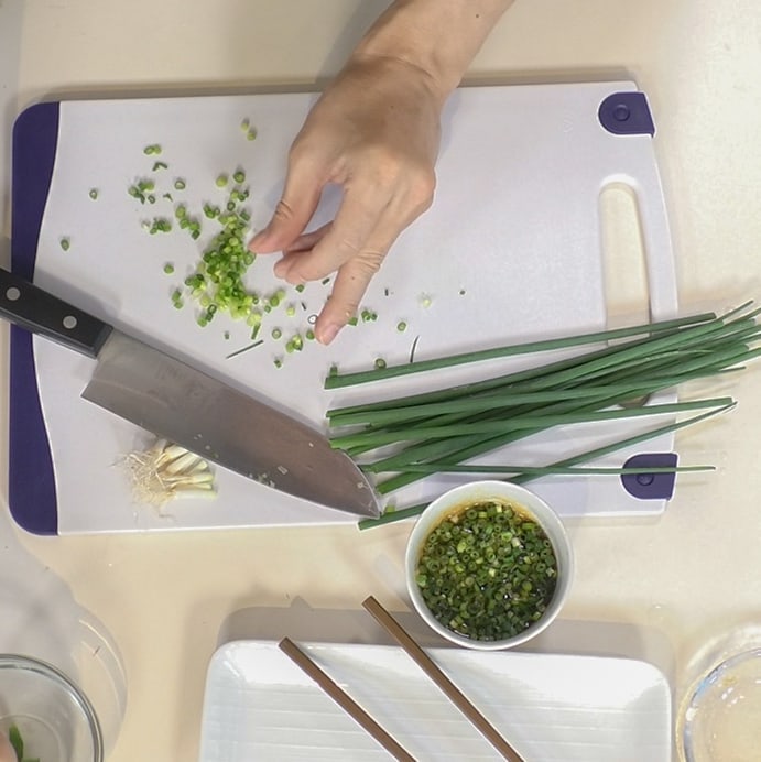 ②あさつき(適量)を小口切り、大葉(適量)を千切りする(※同じぐらいの量にする)