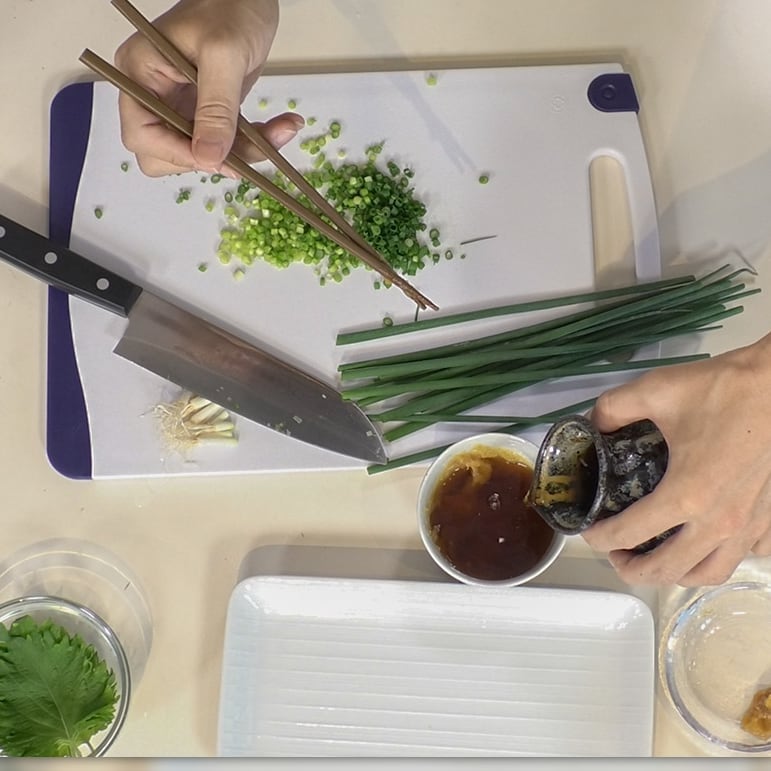 ⑤希釈しためんつゆとあさつき、大葉をたっぷりと加え、よく混ぜたらつけダレの完成!