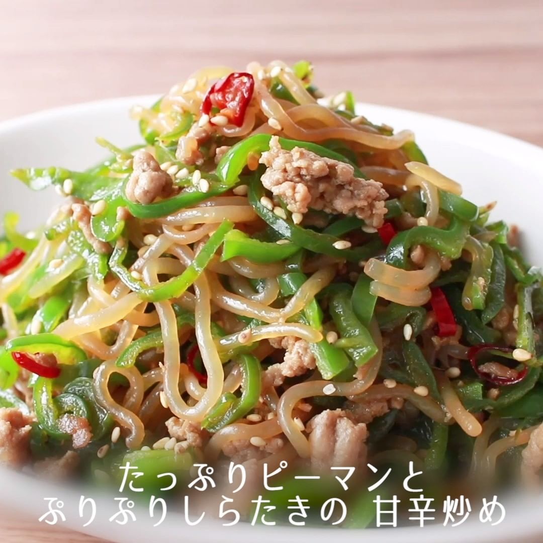 ①たっぷりピーマンと ぷりぷりしらたきの甘辛炒め
