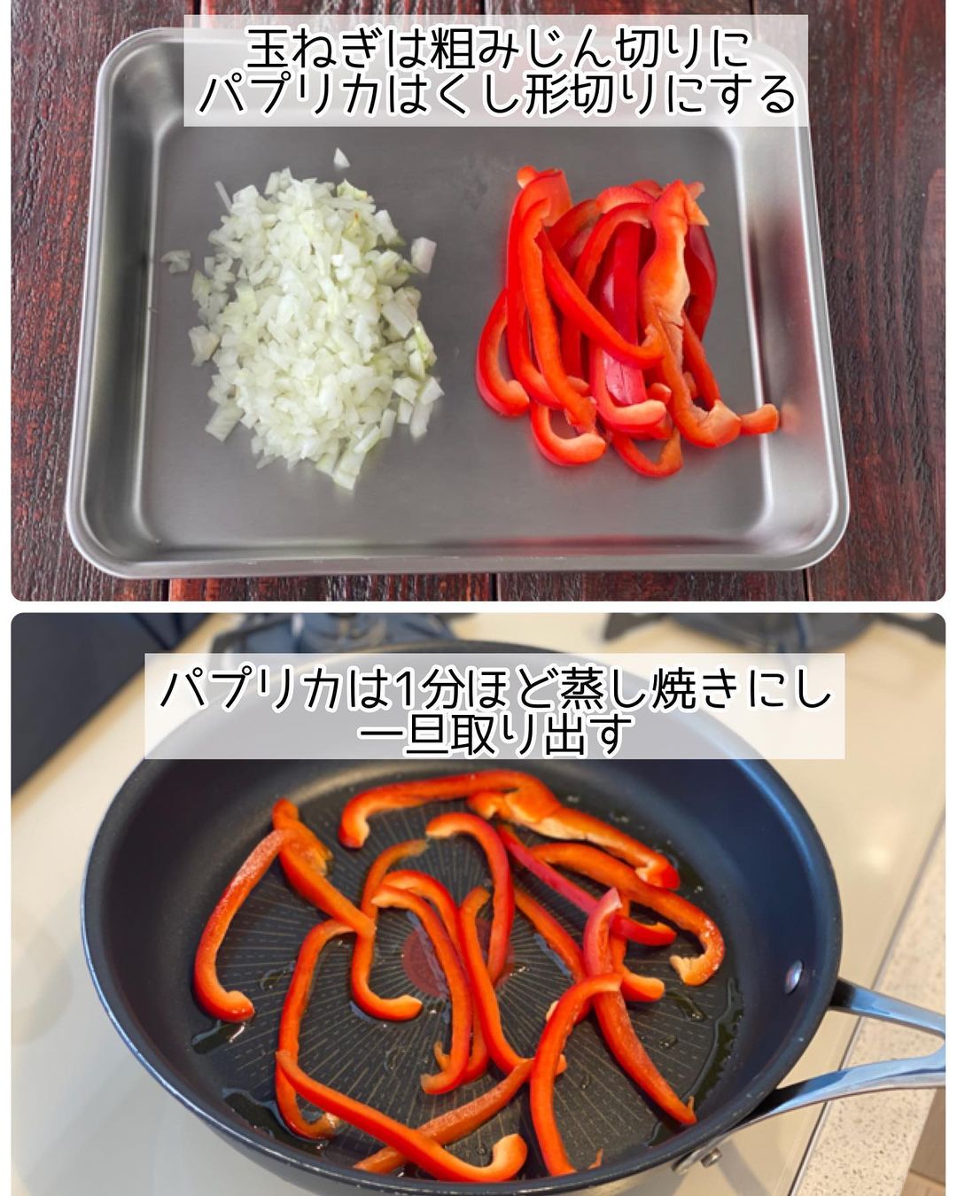 ➋フライパンにオリーブオイル大さじ𝟷/𝟸を強めの中火で熱し、パプリカを加える。蓋をして𝟷分ほど蒸し焼きにして一旦取り出す。