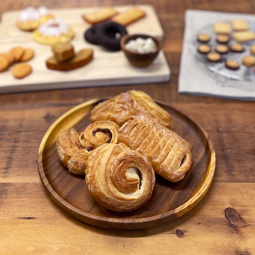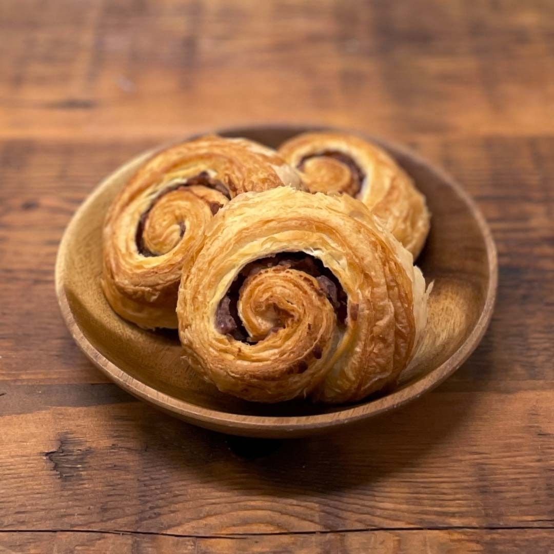 ほど良い甘さの粒あんを巻き込んだ「あんデニッシュ」 、やさしい甘さのカスタードクリームを巻き込んだ「カスタードクリームデニッシュ」。どちらも、しっとりと焼き上げました。