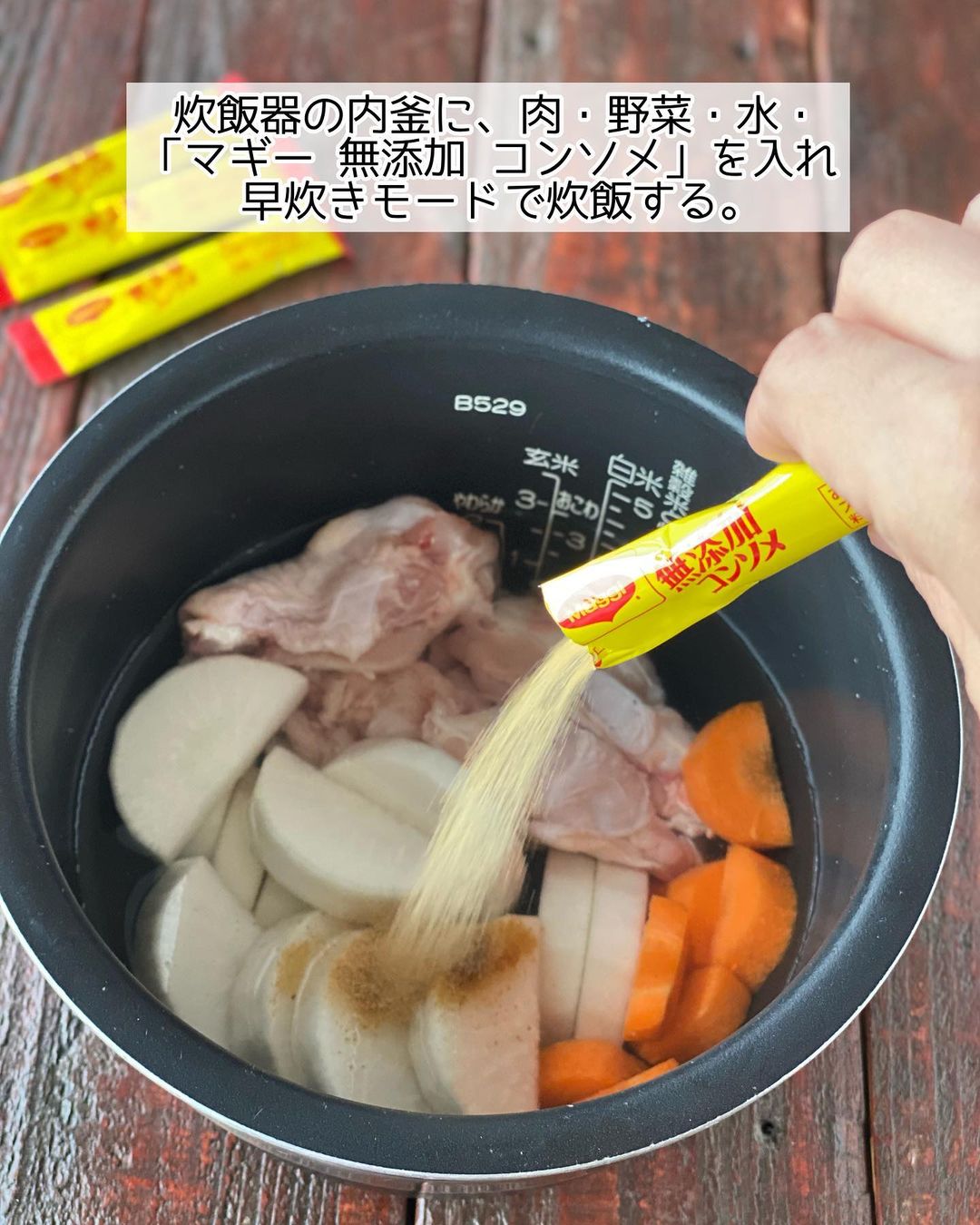 ➋炊飯器の内釜に、鶏手羽元・大根・玉ねぎ・にんじん・〔𝙰〕を入れ、早炊きモードで炊飯する。
