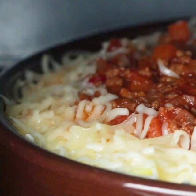 6. グラタン皿にターメリックライスを平たくしきつめ、ホワイトソースを全体に薄くのばし、中央にミートソースをのせる。ホワイトソースの上にピザ用チーズを散らし、220℃のオーブンで20分焼き色がつくまで焼いたら、完成!