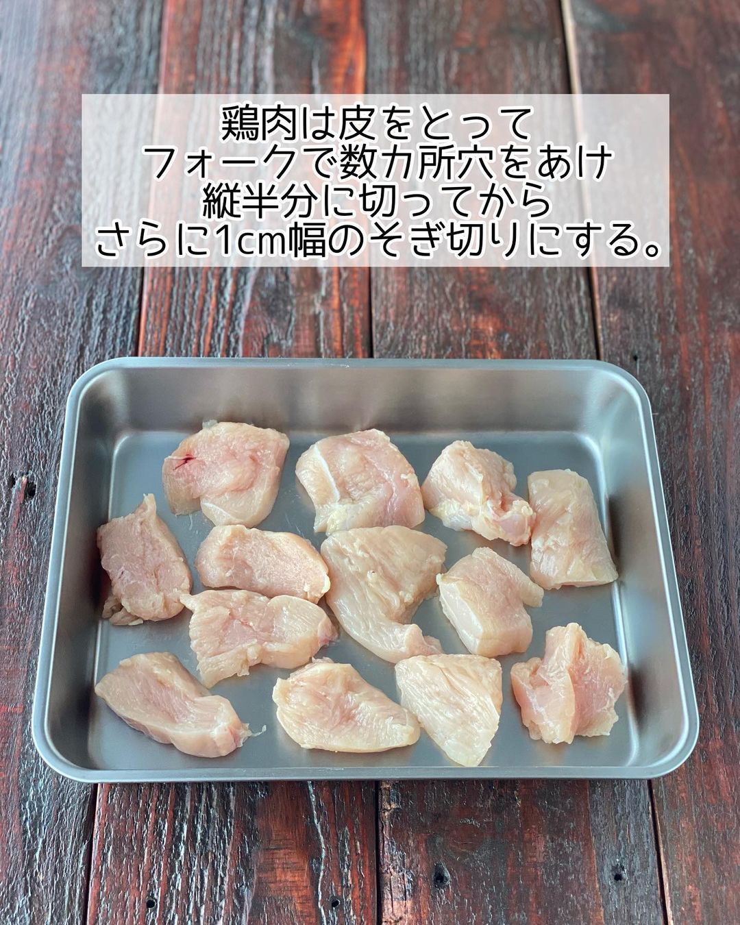 ➊鶏肉は皮をとってフォークで数カ所穴をあけ、縦半分に切ってから、さらに𝟷𝚌𝚖幅のそぎ切りにする。 ポリ袋に入れて〔𝙰〕を揉み込み、空気を抜いて口を閉じる。そのまま𝟷𝟶分ほどおく。(※ここで下味冷凍可能)