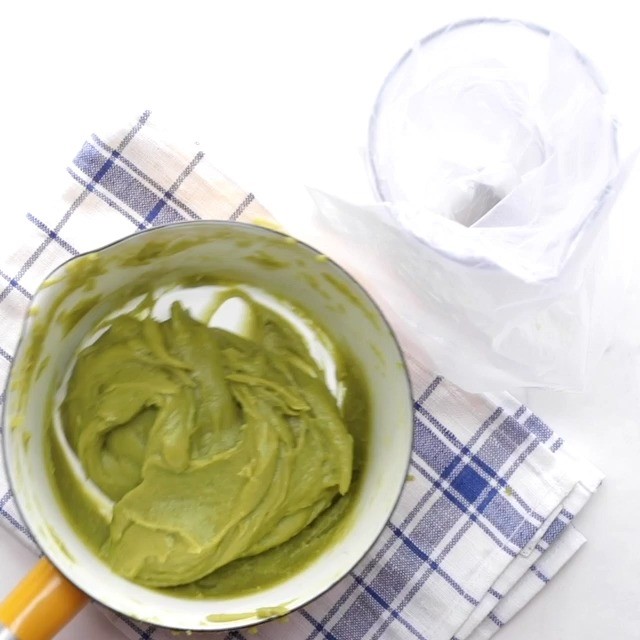 8.シュー生地の底に、抹茶カスタードの入った絞り袋の丸口金を差し込み、クリームを生地いっぱいに詰める。