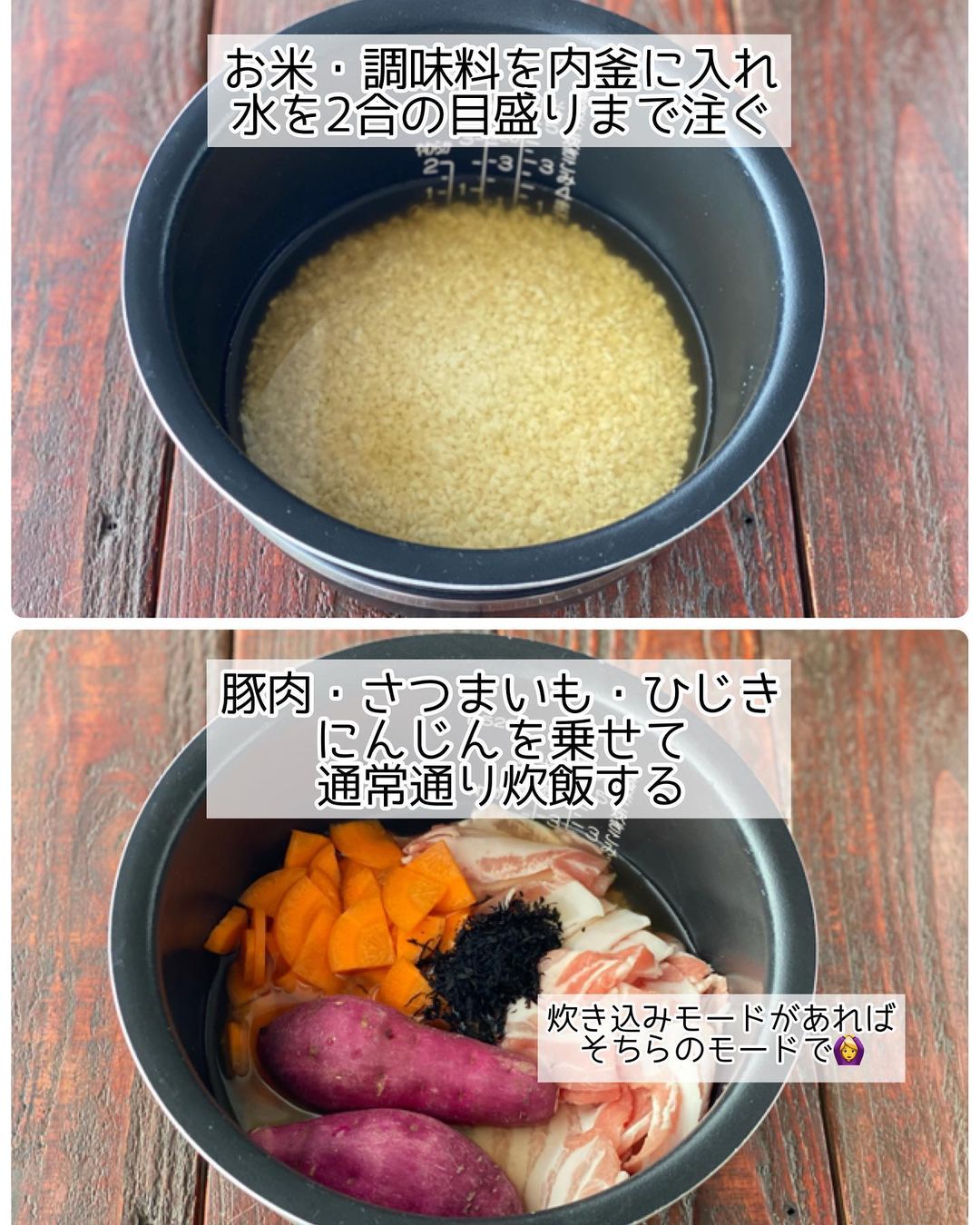 ➋炊飯器の内釜に、お米・〔𝙰〕を入れて、水を𝟸合の目盛りまで注ぐ。豚肉・さつまいも(丸ごと)・にんじん・乾燥芽ひじきを加え、通常通り炊飯する。