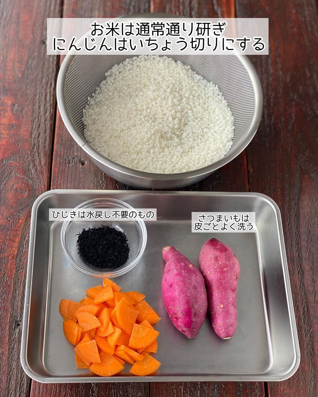 ➊お米は通常通り研ぐ。にんじんは薄めのいちょう切りにする。(さつまいもは皮ごと綺麗に洗っておく)
