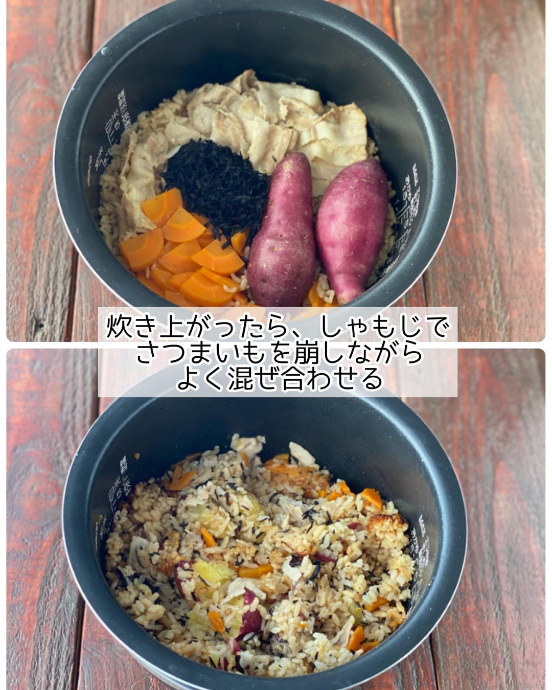 ➌炊き上がったら、しゃもじでさつまいもを崩しながらよく混ぜ合わせる。