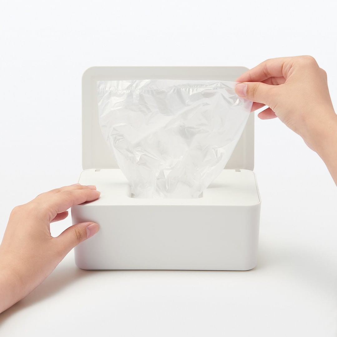 45Lのごみ袋が32枚入った大容量タイプは、無印良品の『ポリプロピレン ウェットシートケース』に入れて保管できます。ごみ袋を引き出すときは、ケースに手を添えてしっかりとおさえるようにしてください。