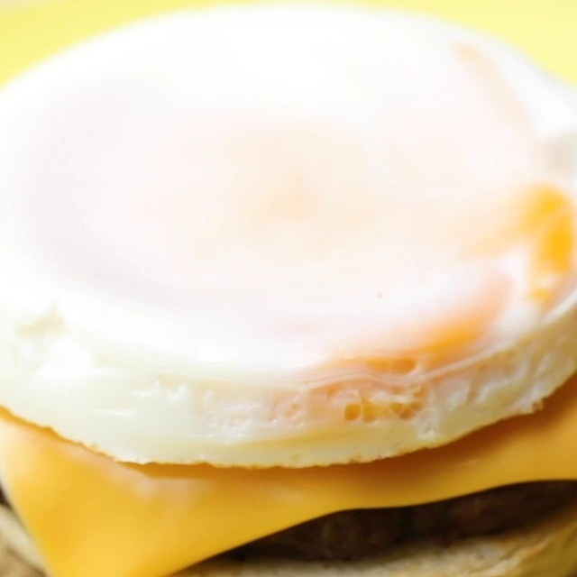9.皿にバンズをのせ、パティ、スライスチーズ、目玉焼き、ベーコンをのせ、ソースをかけてバンズで挟んだら、完成!