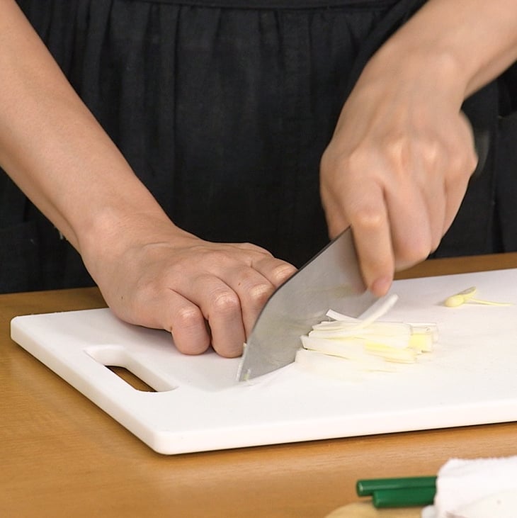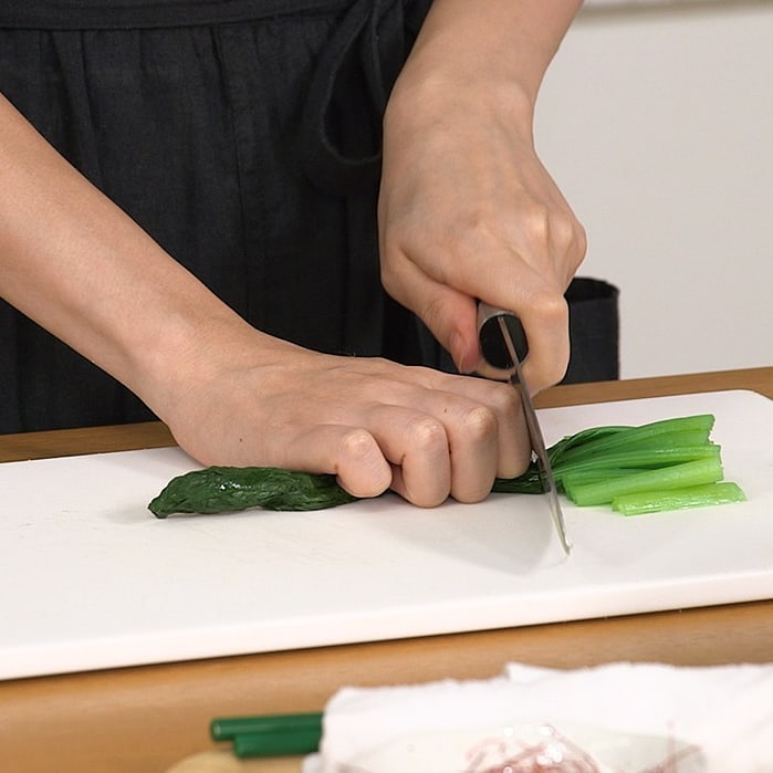 ④トッピング用の白髪ねぎ少々、小松菜1束を5cm幅、煮卵1個を半分に切る