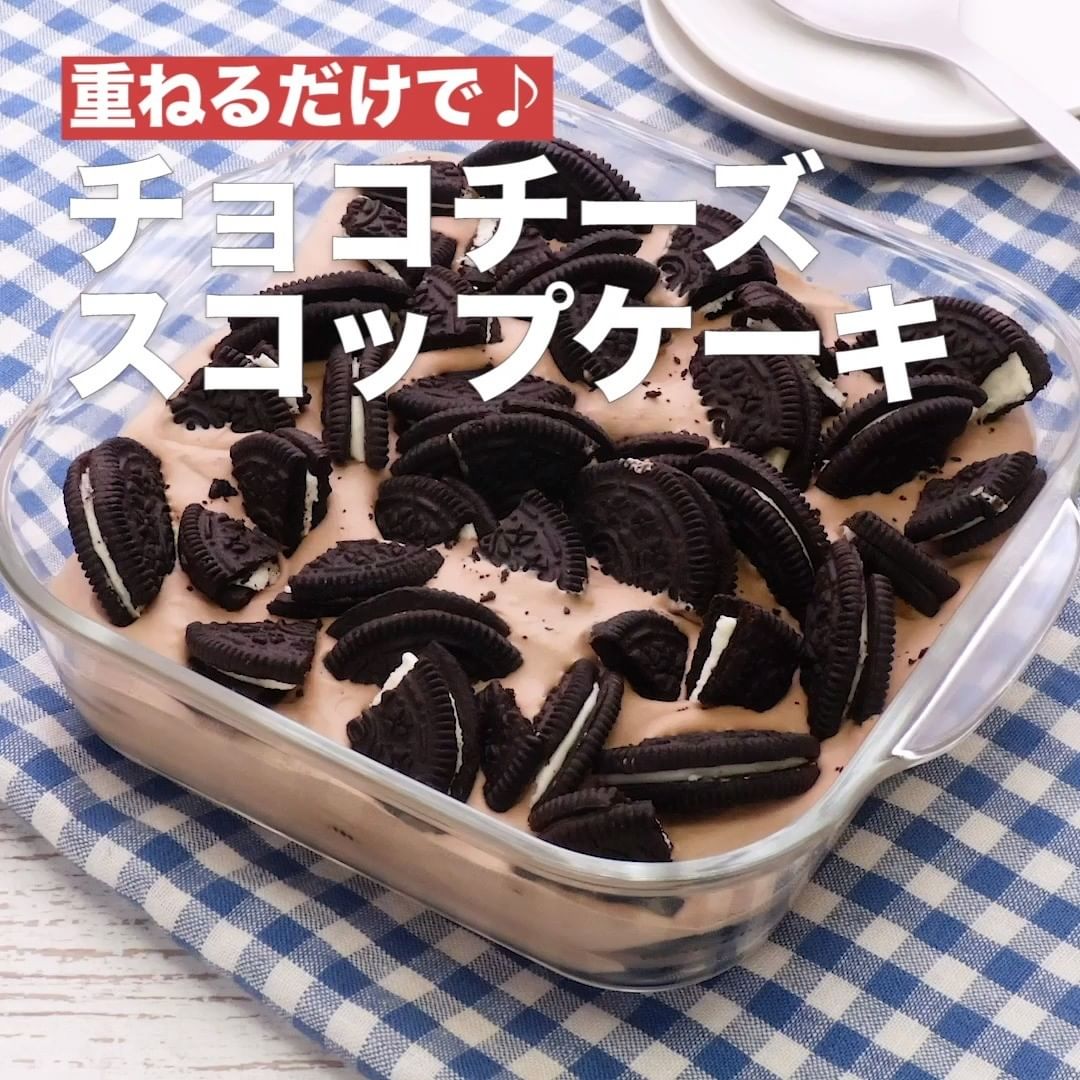 クッキーとチョコチーズクリームを重ねて簡単スコップケーキに!冷蔵庫で寝かせることでクッキーがしっとりとしてケーキのような食感になります。